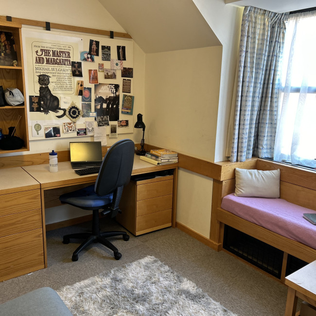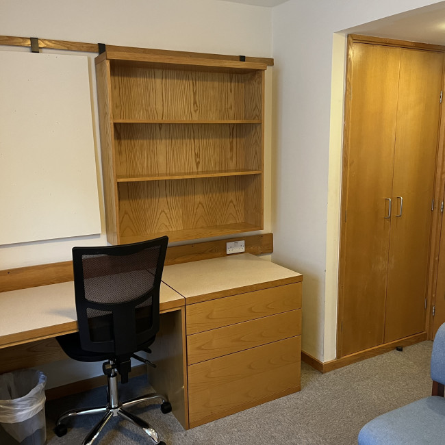 - Bedroom – single bed, desk, desk chair, desk lamp, drawers, wardrobe, casual chair